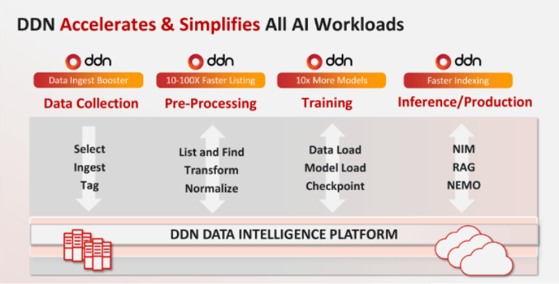 DDN provides an abstraction layer that unifies data ingestion, labeling, training, inference, and visualization workflows across the enterprise. It supports common AI and ML tools, integrates with frameworks such as RAG and vector search, and centralizes metadata management.